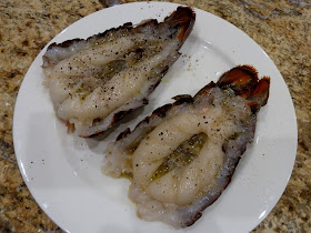 I'm a lobster lover and have posted several recipes using lobster in the past such as lobster with pasta and white wine-butter sauceseafood cobb saladKorean seafood pancakes, and hibachi shrimp (or lobster).  Lobster tails are a perennial favorite but can be messy in the kitchen so I prefer them on the grill.  We used to simply cut them in half lengthwise for grilling but they tend to really curl up.  I recently discovered another method that slightly edges out the old method because it leaves the lobster tail intact so it's easier to handle on the grill, while having the same advantage of exposing the flesh for even cooking.